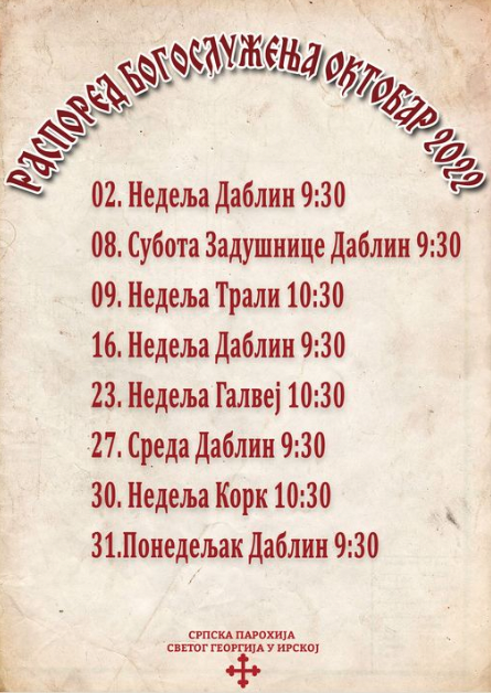 Распоред Богослужења за Oктобар 2022